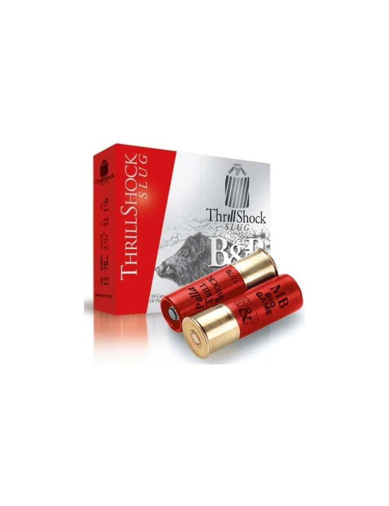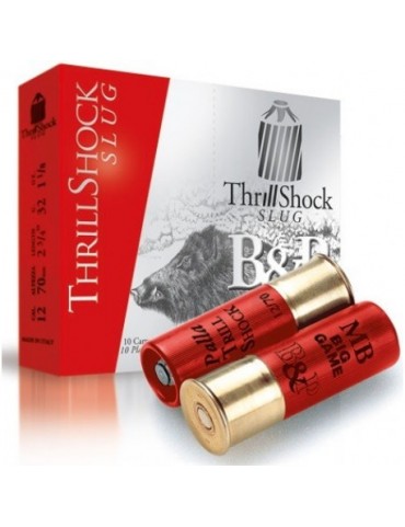 La balle Thrill Shock Slug est une balle en plomb munie d'un empennage plastique avec 18 nervures hélicoïdales, qui lui confère une excellente précision, une très grande vitesse de 480 m/s et une expansion optimale sur tous les types de grand gibier, et notamment sur les sangliers.