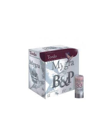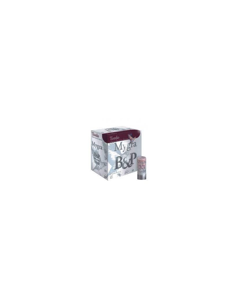 La cartouche de chasse Mygra Tordo 12 de B & P est chargée de 33 grammes de plombs N°9,5 ayant subi un traitement de surface doré qui assure une meilleure pénétration qu'un plomb durci traditionnel.