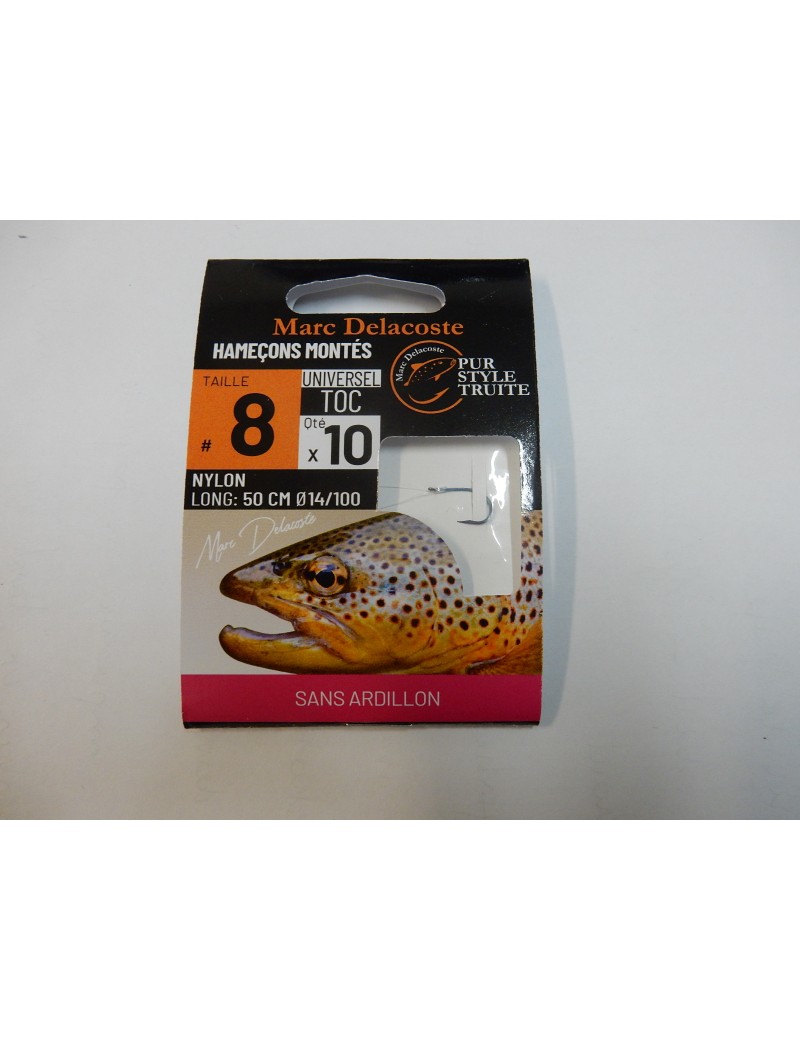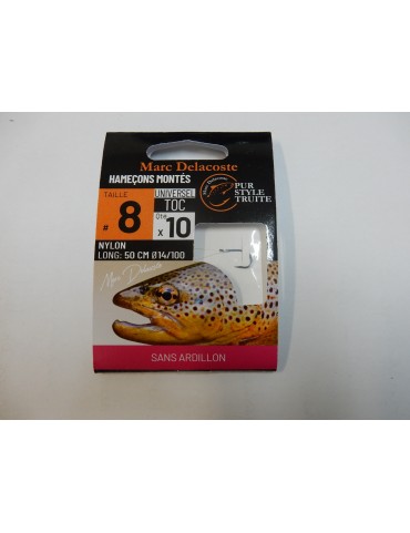 Les hameçons de la gamme marc delacoste sont des hameçons de très grande qualité de fabrication Japonaise. Ils possèdent un piquant exceptionnel et durable, même après plusieurs frottements sur les galets du fond. Ils ont en outre été sélectionnés pour une utilisation spécifique des principaux appâts permettant de pêcher la truite : forme, courbure, finesse de fer, longueur de hampe, autant de critères pris en compte pour sélectionner des hameçons spécifiquement destinés à la pêche au ver, à la teigne, aux larves aquatiques ou à la mouche naturelle.