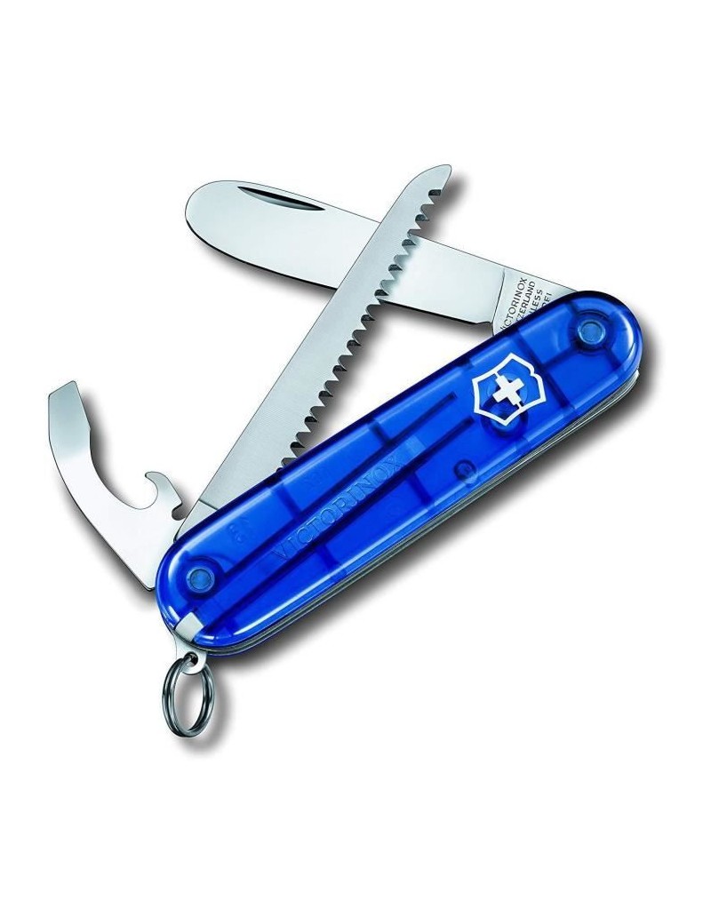 Voici la version bleue translucide du très célèbre My First Victorinox, le couteau suisse destiné aux enfants et aux plus jeunes. La différence est que ce modèle se dote d'une scie à bois supplémentaire : soit un total de 9 fonctions différentes. Les enfants bénéficieront, en plus de la scie à bois pour la forêt, d'un décapsuleur, d'un ouvre-boîtes ainsi qu'une grande lame en inox à bout rond. Le bout arrondi ne doit rien au hasard : il permet aux enfants de manipuler le couteau en toute sécurité sans craindre les blessures. Par conséquent, les parents pourront laisser les enfants imiter les grands aventuriers sans devoir vérifier leurs gestes à chaque instant : de quoi profiter de l'instant présent en toute sérénité. La paire de côtes bleue translucide confère au My First Victorinox H un côté très moderne, d'un design au goût du jour.