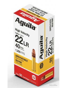 Munitions à balle Aguila 22 LR 40 grains Haute Vitesse (HIGH VELOCITY) à ogive cuivrée. Ogive 40 grains haute vitesse. Cartouche vélocité standard : 1255 fps (383 m/s) soit une énergie de 140 joules. Cette munition offre précision sans pareil.