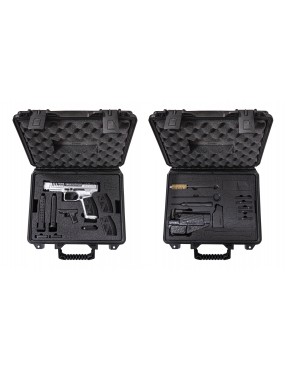 Il est livré dans une mallette rigide sur deux étages avec différents accessoires (Chargeurs, grips, kit de nettoyage, holster, platines point rouge, puits de chargeur, outil de démontage...)